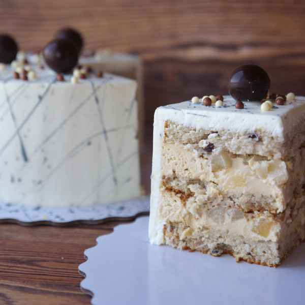 - Торт "Карамель-Груша" - сочный бисквит с грушей и орехом, крем с мягкой карамелью и томлёная пряная груша в начинке (в составе присутствует мед). Стоимость: 70 руб/кг