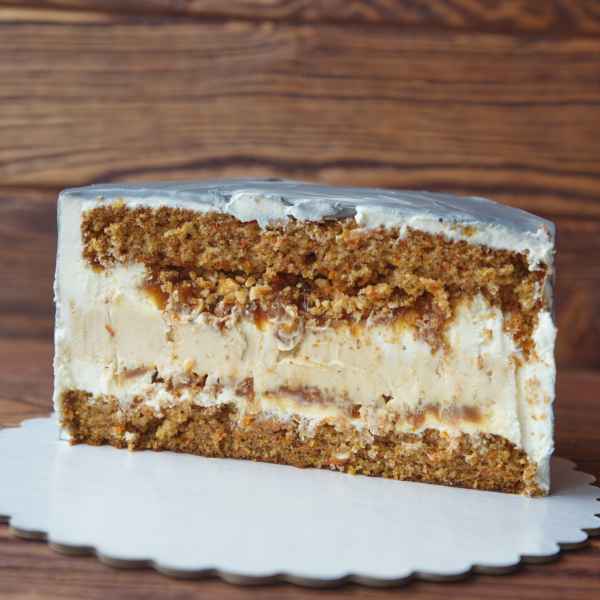 - Торт "Морковный с чизкейком" - пряный морковный бисквит с апельсиновой цедрой, запечённый карамельный чизкейк, мягкая солёная карамель, хрустящий карамелизованный фундук и сырно-сливочный крем. Стоимость: 70 руб/кг